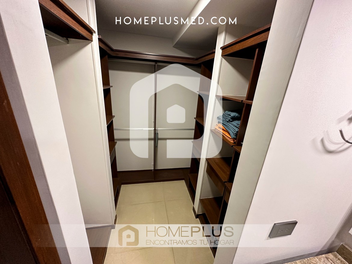 El diseño del apartamento incluye dos habitaciones: la primera con un closet amplio y acceso al baño completo ubicado en el hall, mientras que la habitación principal dispone de su propio baño en suite y un amplio walking closet. La zona de ropas se encuentra convenientemente ubicada para facilitar las labores del día a día. Además, el apartamento cuenta con Wi-Fi y un parqueadero privado para mayor comodidad.
