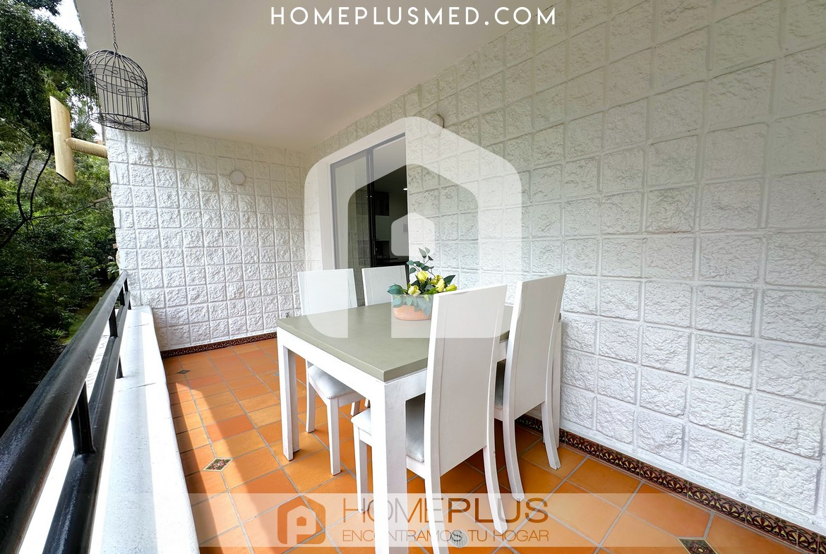 El apartamento cuenta con una sala de estar acogedora, perfecta para momentos de relajación, además de un comedor para cuatro personas. El balcón, equipado con una mesa auxiliar, es ideal para disfrutar de la vista y el aire fresco. La cocina abierta está completamente equipada, y junto a ella se encuentra una práctica zona de lavandería y un cuarto de servicio con baño.
