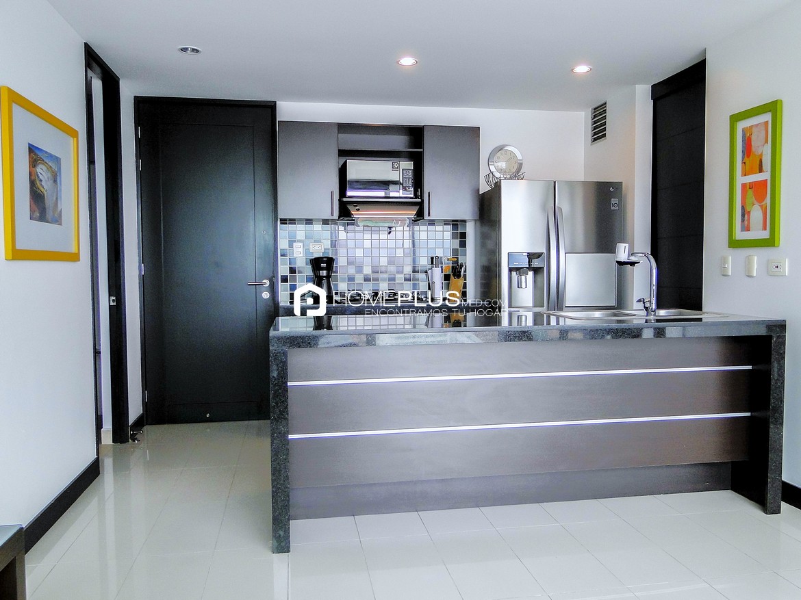 La cocina, abierta e integrada al espacio social, está completamente equipada con electrodomésticos de alta calidad y generosos espacios de almacenamiento. La zona privada está compuesta por una habitación con cama King Size, walk in closet y baño privado con ducha, garantizando privacidad y confort. Además, el apartamento dispone de un baño social adicional, ideal para visitantes.