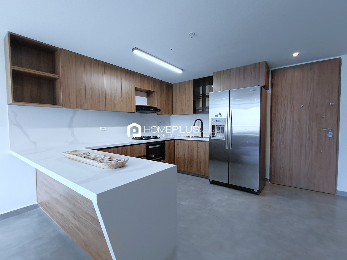 El apartamento ofrece 2 habitaciones amplias, cada una con buena iluminación natural y ventilación cruzada. La habitación principal incluye baño privado y walk-in closet, lo que aporta comodidad y orden. También dispone de otro baño completo con ducha, útil tanto para visitas como para uso diario. La cocina integral está equipada con extractor, horno empotrado y nevecon. Junto a ella, se encuentra una zona de ropas independiente, con lavadora y secadora, ideal para quienes valoran la funcionalidad diaria.