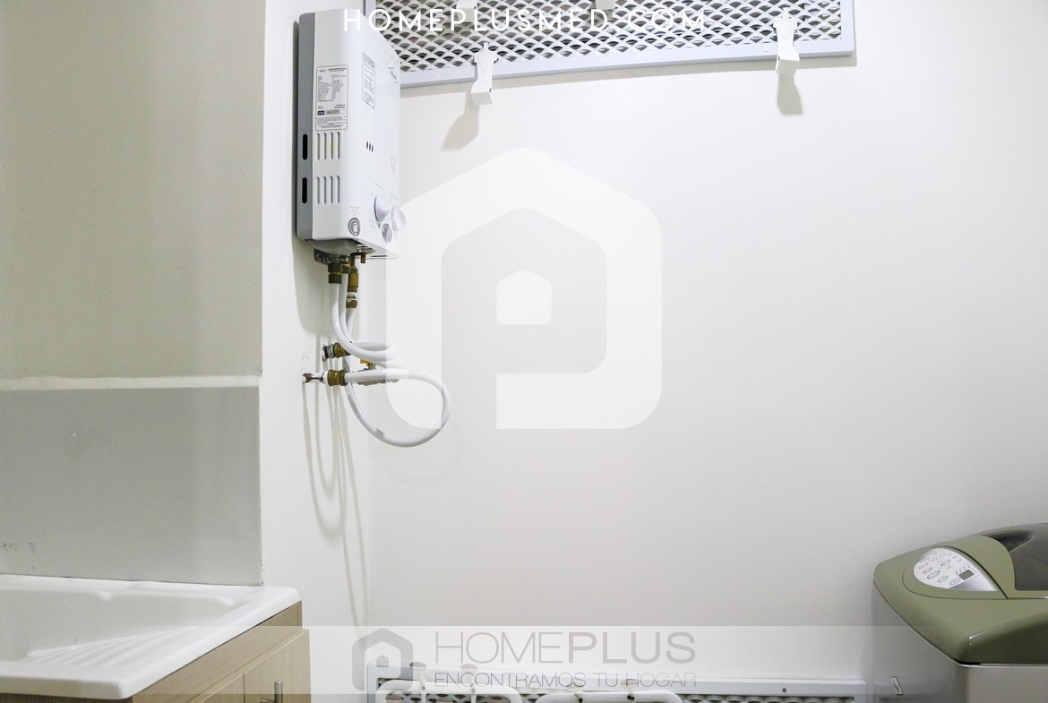 El apartamento cuenta con una habitación principal equipada con cama doble, televisor, walk-in closet, y un baño privado con ducha. Además, dispone de un área de trabajo con escritorio y silla giratoria, ideal para quienes necesitan un espacio de estudio o teletrabajo, con acceso directo al balcón. La cocina moderna está completamente equipada con utensilios y electrodomésticos, incluyendo una barra de desayunos con dos sillas, perfecta para comidas informales. En la zona de limpieza, encontrarás lavadora, lavadero, tendedero plegable y calentador de agua. La sala es amplia y cómoda, decorada con un sofá para tres personas y otro escritorio de trabajo, además de tener fácil acceso al baño social. Dispone de Wi-Fi y un parqueadero privado, y la propiedad destaca por su excelente ventilación e iluminación natural.
