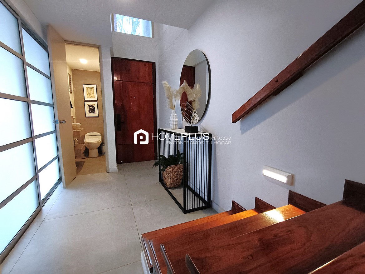 Esta casa en venta en El Poblado ha sido diseñada con una distribución inteligente en tres niveles, que brinda independencia entre las áreas privadas y sociales. En el nivel superior se encuentran tres habitaciones, incluyendo una habitación principal con baño privado completo, hall de alcobas y un baño adicional para las habitaciones auxiliares. Cada espacio ha sido pensado para maximizar la luz natural y ofrecer un ambiente cómodo y acogedor para la vida familiar.