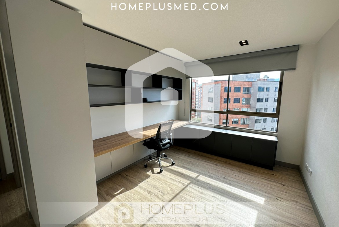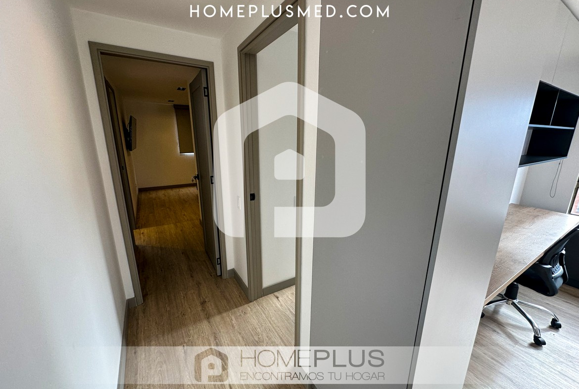 Hall de alcobas con closet de linos, baño social, espacio de trabajo o estudio con una mesa en madera, silla giratoria, gabinetes de almacenamiento y excelente luminosidad.