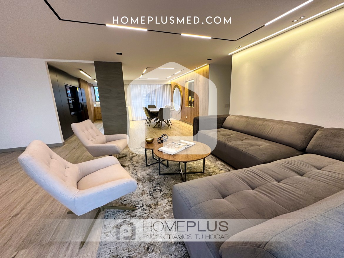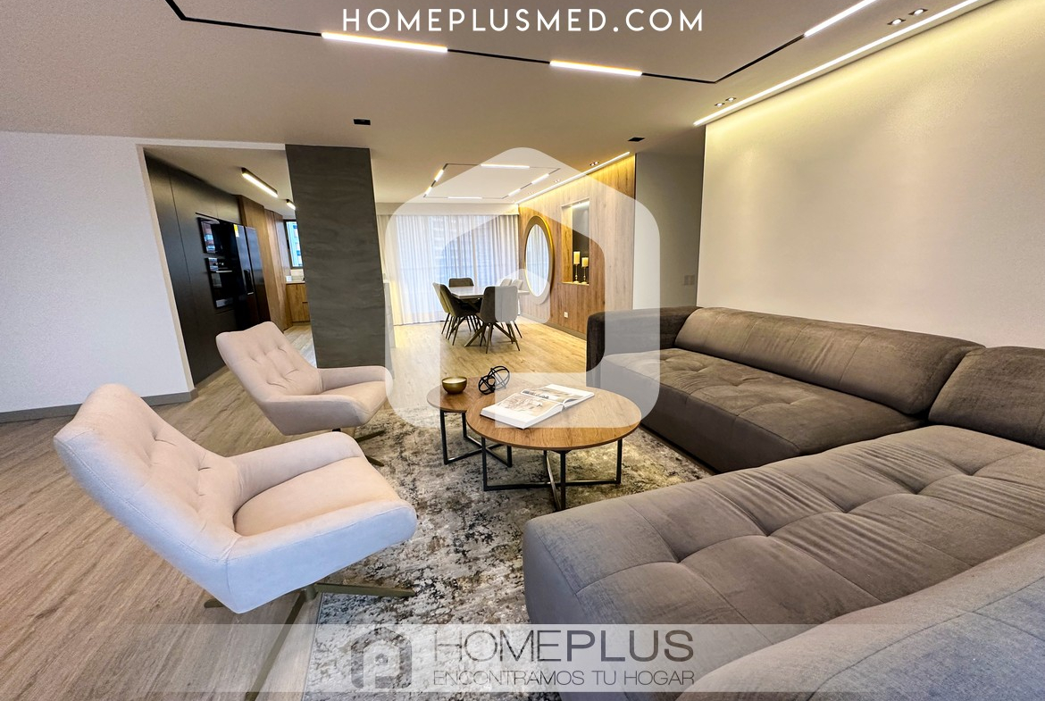 La sala está amoblado con un sofá en L para seis personas, dos mesas de centro, dos sillas de diseño. Al lado del salón, hay un sofá de tres puestos, un centro de entretenimiento en madera y un Smart TV. Balcón principal con una vista increíble de la ciudad, decorada con una mesa pequeña redonda y silla de exterior, será el lugar perfecto para disfrutar de una copa de vino en las noches de verano. El área del comedor dispone de una mesa para seis personas. La cocina es abierta y está completamente equipada.